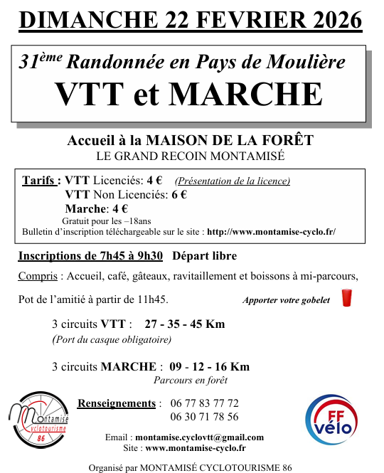 31e Randonnée en Pays de Moulière - VTT et marche - Dimanche 22 février.